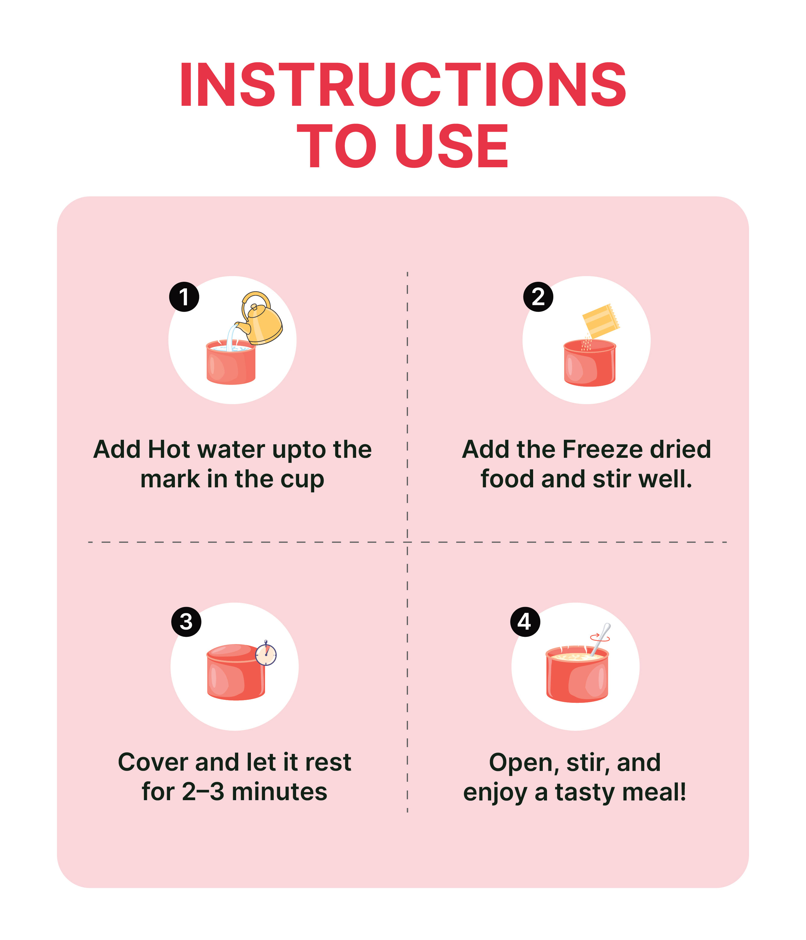 Preparing a FOT meal is simple and quick. Just add hot water as mentioned on the pack, stir well, cover, and wait a few minutes. Your meal will be ready to enjoy. You can also prepare it using a microwave oven for added convenience.