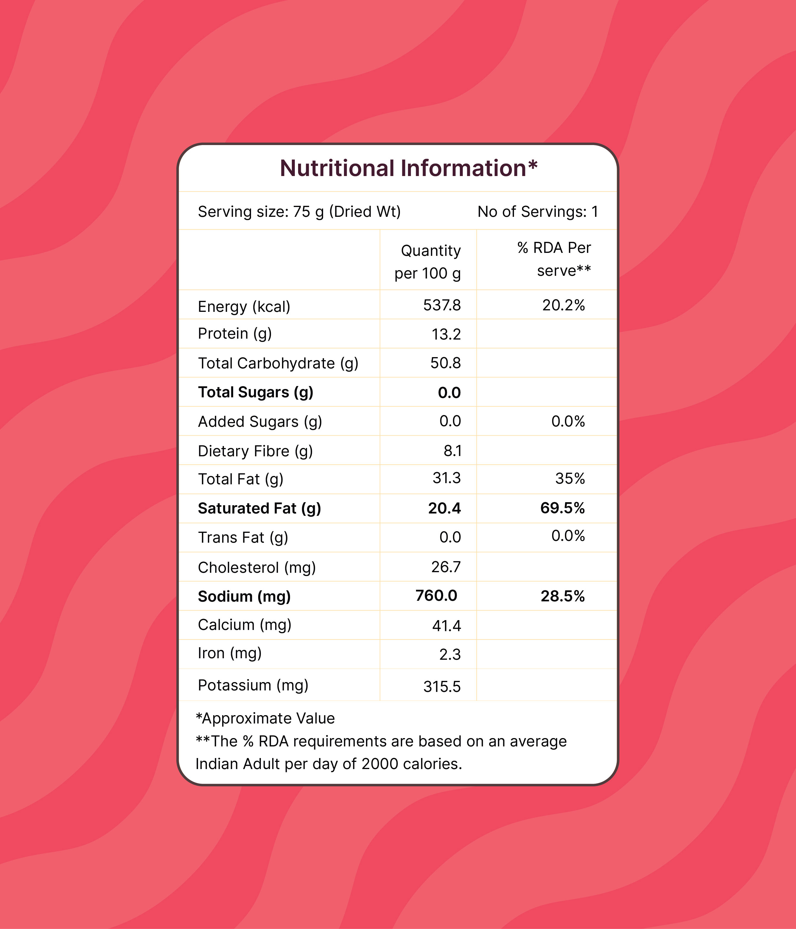 Rice (50%), Moong Dal (25%), Ghee, Cashew Nut, Cumin, Salt, Curry Leaves, Green Chilli, Ginger & Black Pepper.
