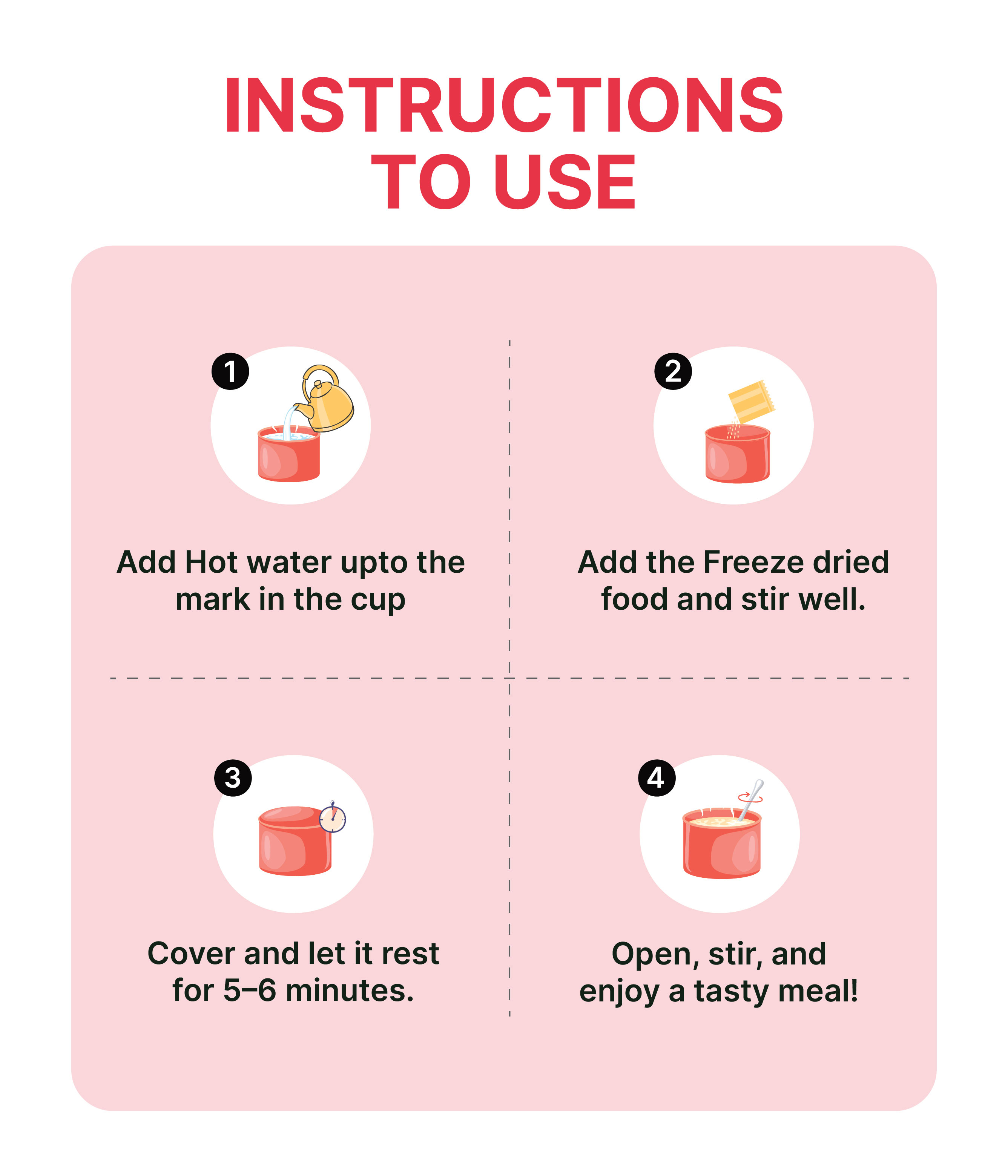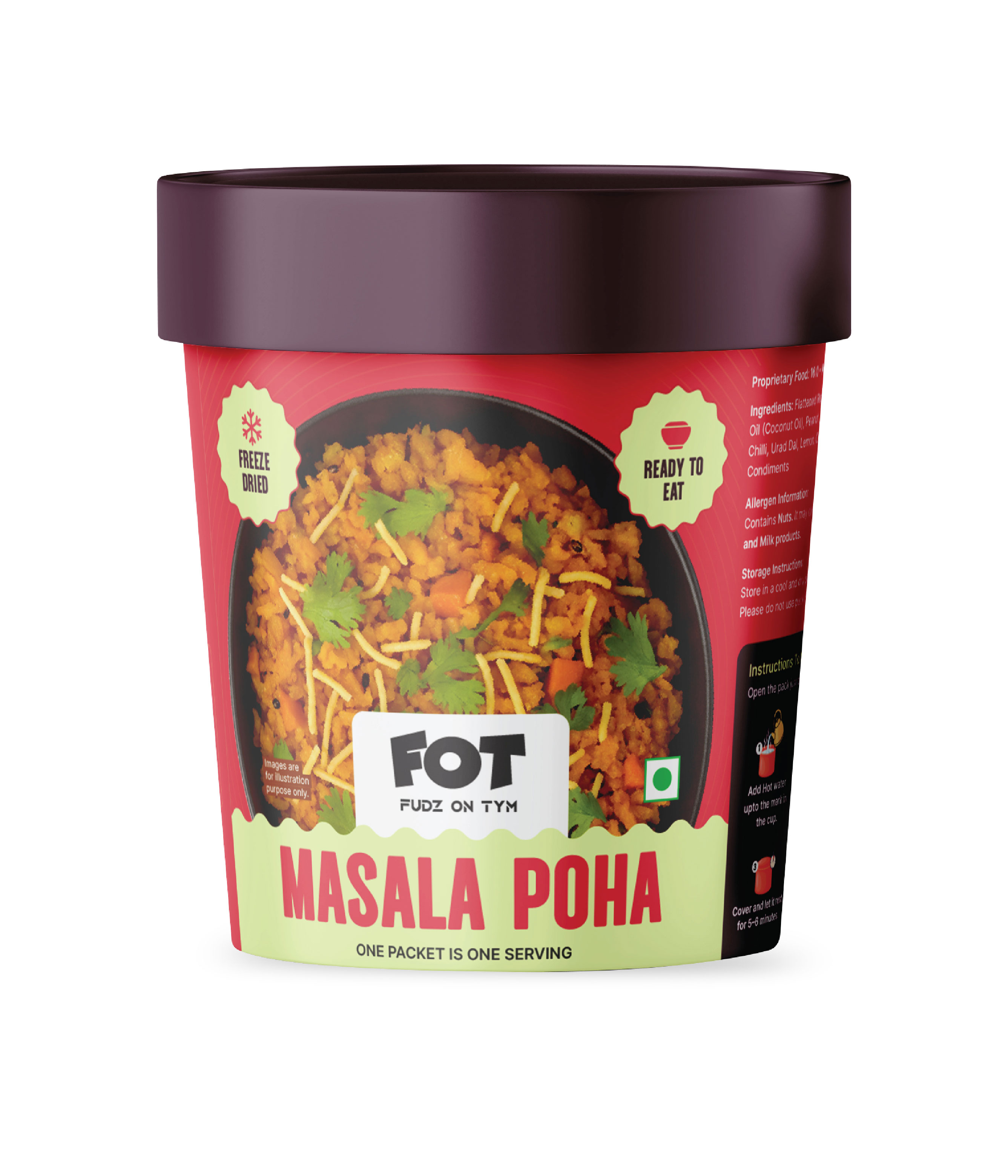 Preparing a FOT meal is simple and quick. Just add hot water as mentioned on the pack, stir well, cover, and wait a few minutes. Your meal will be ready to enjoy. You can also prepare it using a microwave oven for added convenience.